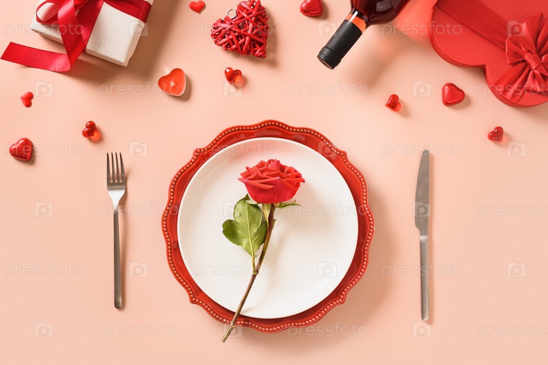 Сервировка стола на день святого валентина с подарком, бутылкой красного вина, розами, сердечками