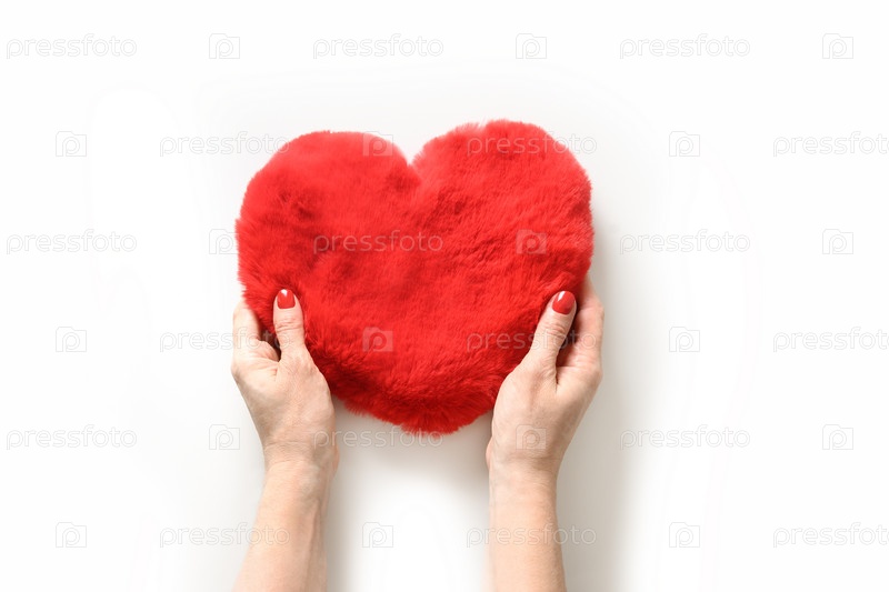 Женские руки держат меховое красное сердце на белом фоне. Вид сверху. Открытка на день Святого Валентина