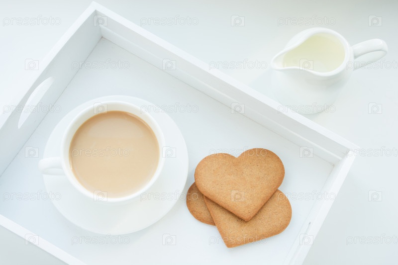 Ранний завтрак. Белая кружка горячего кофе с молоком, печеньем и молочным кувшином в белом подносе. Вид сверху