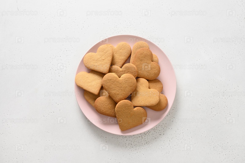 Печенье в форме сердца на розовой тарелке на белом фоне. Вид сверху