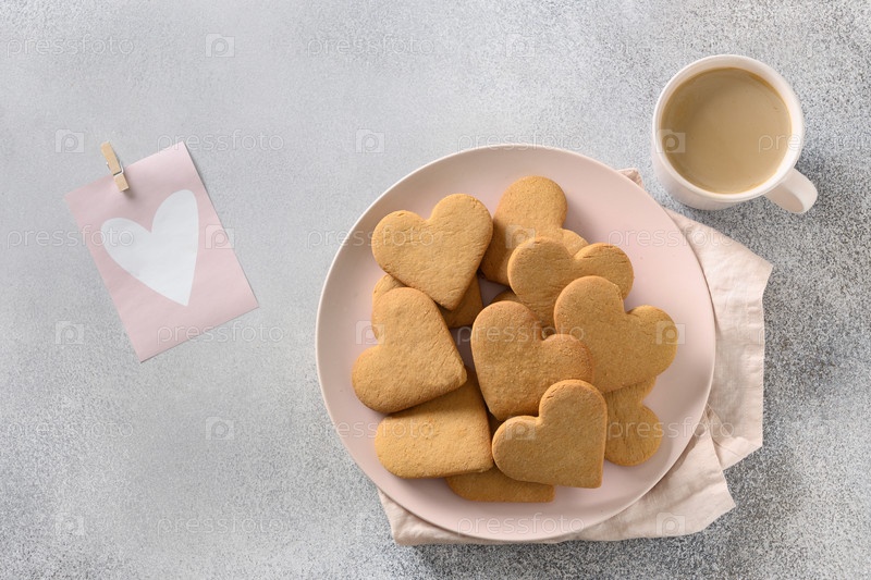 Печенье в форме сердца на розовой тарелке с кофе и любовью на сером фоне. Вид сверху. Завтрак в День святого Валентина