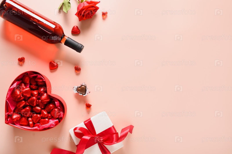Открытка на день святого валентина с красным вином, подарком, сердечками, шоколадными конфетами и красными розами на розовом фоне. Вид сверху. Место для ваших поздравлений