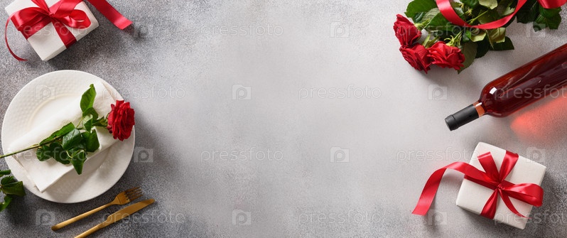 Баннер дня святого валентина с подарком, красным вином, романтической сервировкой стола и красными розами