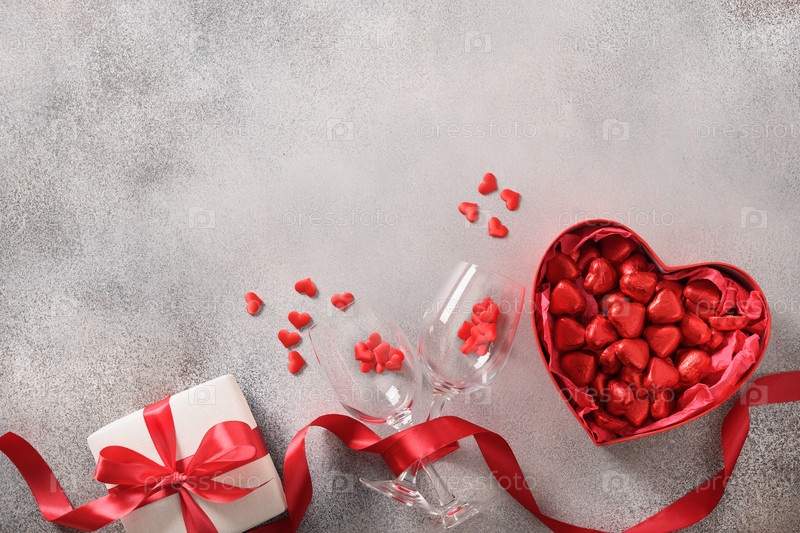 Открытка на день святого валентина с омантическим подарком и цветами красных роз