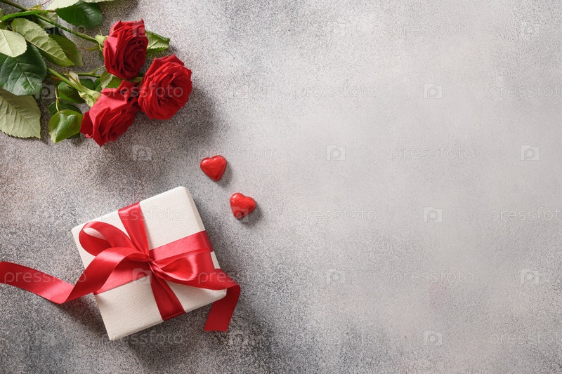 Открытка на день святого валентина с подарком, красными розами, шоколадными конфетами