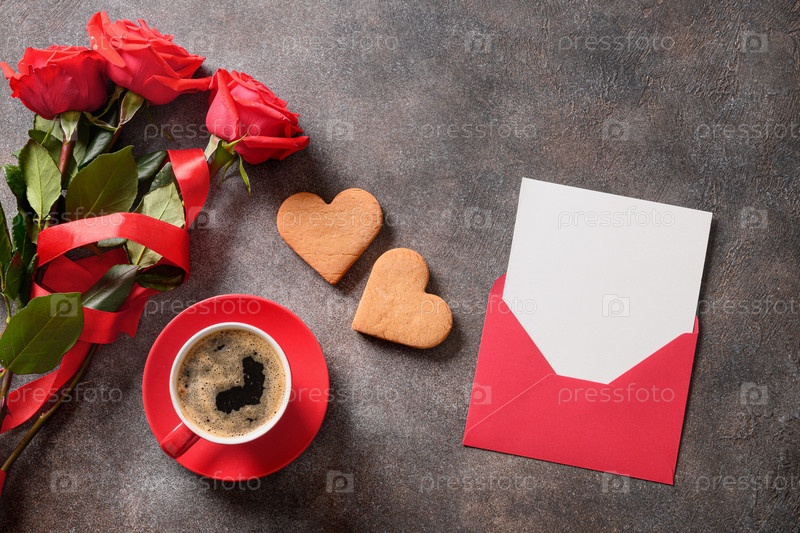 Открытка на день святого валентина с чашкой кофе, двумя печеньями в форме сердца и любовным письмом с местом для текста. Вид сверху
