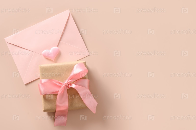 Валентинка с розовым конвертом с сердцем и романтическим подарком. Вид сверху. Место для текста