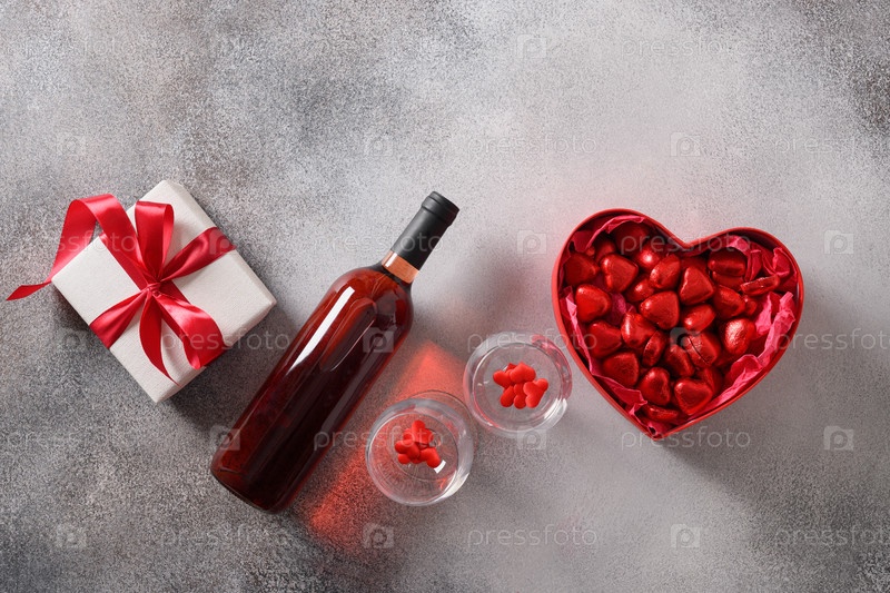 Открытка на день святого валентина с шампанским, романтическим подарком и цветами красных роз