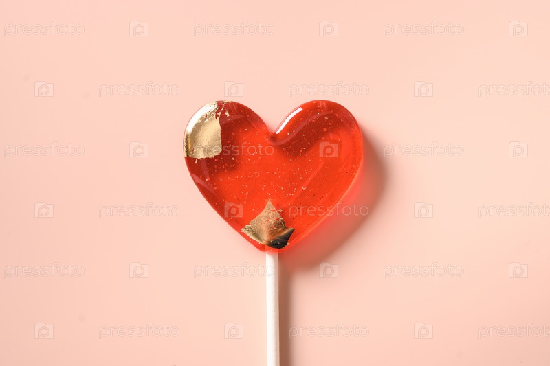 Леденец красная конфета на палочке на розовом фоне. Вид сверху. Минимальная открытка на день святого валентина