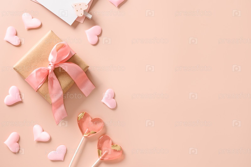 Заготовка на день святого валентина для любовного письма, двух леденцов на палочке и розовых сердечек