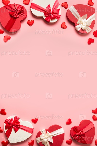 Концепция Дня святого Валентина с красными коробками и сердцами на розовом
