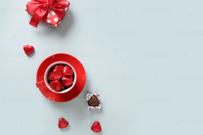 Поздравительная открытка на день святого валентина с красными сердечными сладостями, подарком и чашкой на синем