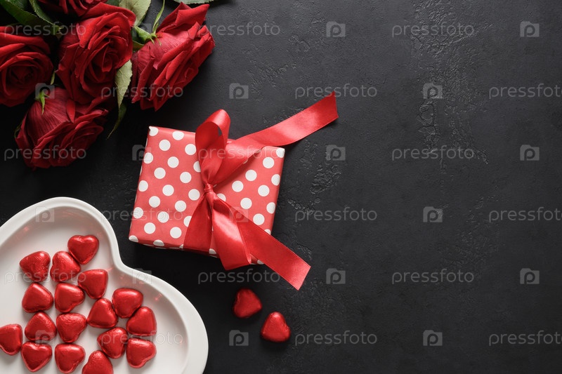 Подарок на день святого валентина, шоколадные конфеты и красные розы на черном фоне