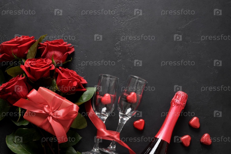 Шоколадные конфеты, красные розы и красное вино с подарком на черном фоне на день святого валентина