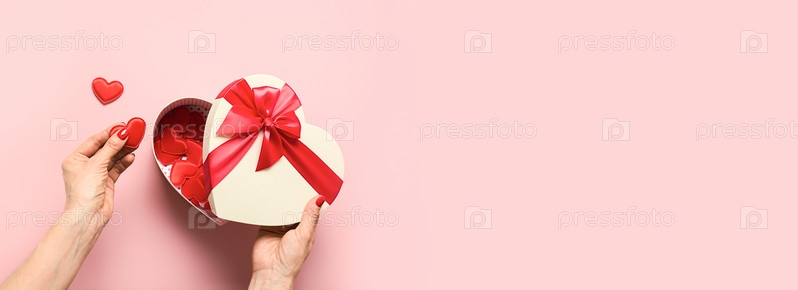 Женские руки держат красные сердца из подарочной коробки ко Дню святого Валентина на розовом. Романтическая открытка