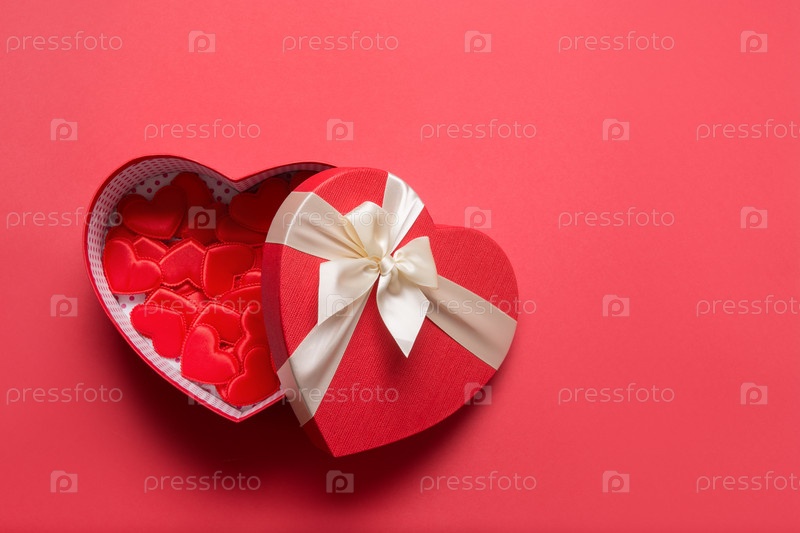 Подарки сердца дня валентинки на красном цвете. Плоская укладка. Романтическая открытка с копией пространства