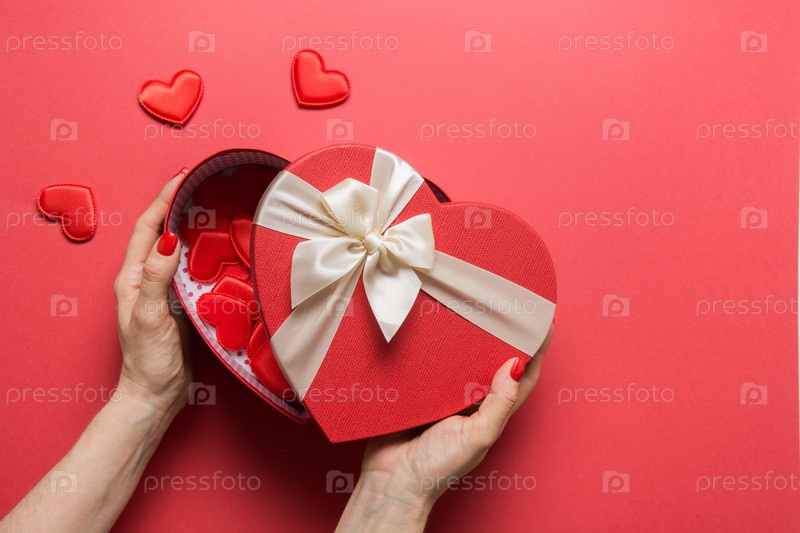 Коробка сердца дня валентинки в руках женщины на красном цвете. Романтическая открытка с копией пространства