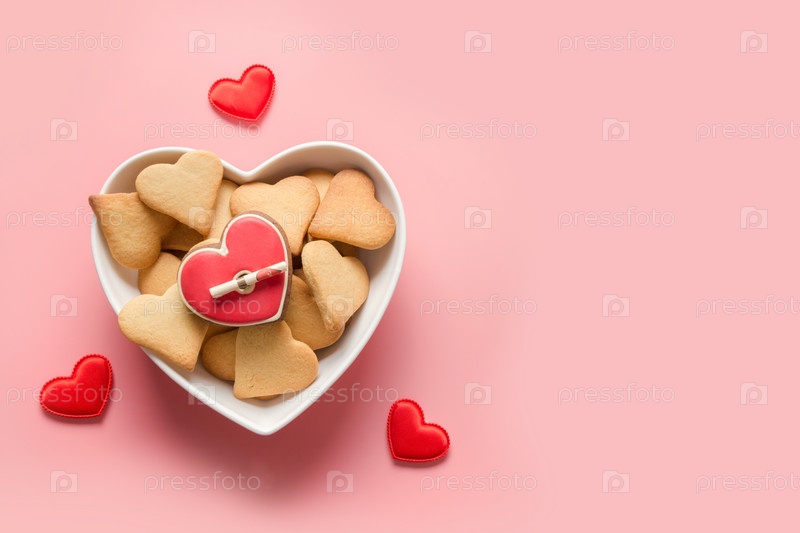 Домашний торт на День святого Валентина. Печенье в форме сердца в тарелке на розовом. Вид сверху