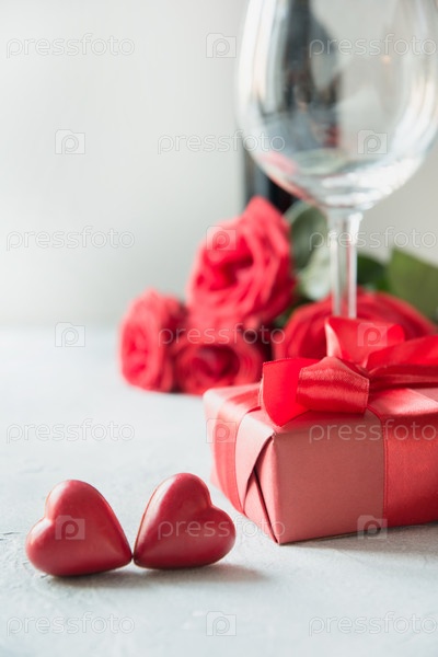 Романтический красный подарок со сладостями и красным вином. Открытка на день Святого Валентина