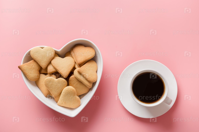 Чашка кофе и печенье в тарелке в форме сердца на розовом. Валентинка. Плоская планировка, пространство для копирования