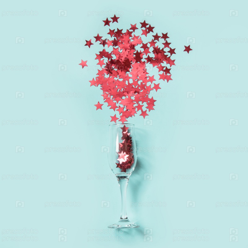 Красные конфетти в форме звезд вылили бокалы с шампанским на синее