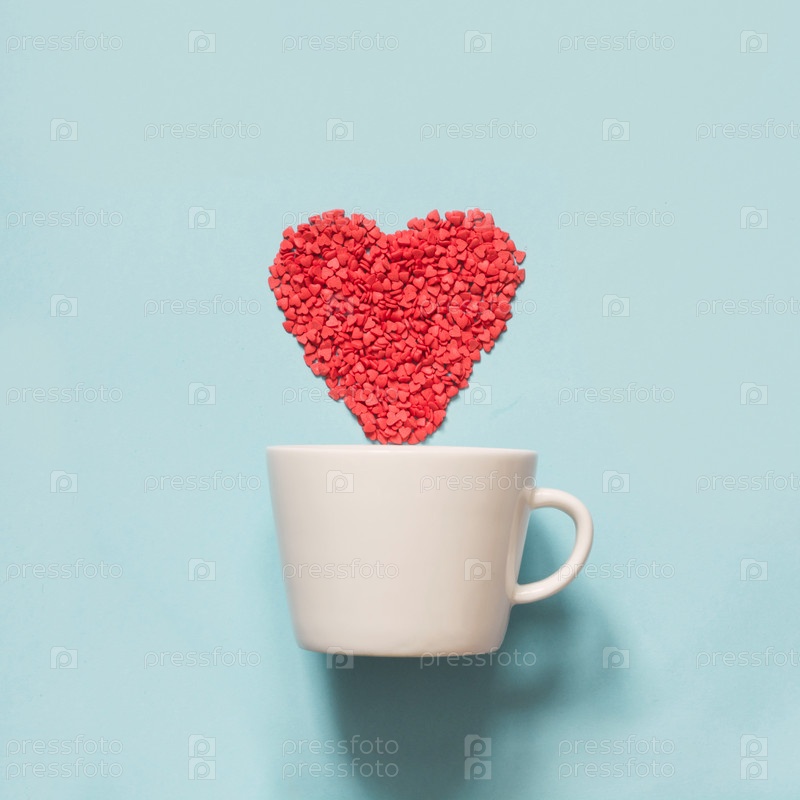 Валентинка. Творческое сердце красного конфетти в чашке. Вид сверху. Плоская укладка