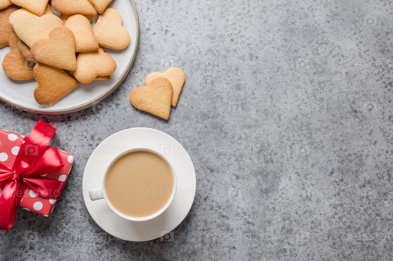 Открытка на день святого валентина с сердечным печеньем и кофейной чашкой на сером каменном столе
