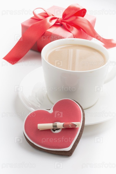 Чашка кофе с любовным письмом и подарочной коробкой на белом. Валентинка. Концепция любви