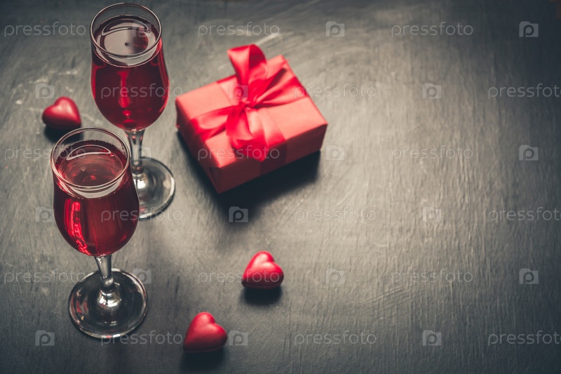 Валентинка с шампанским и сердечными конфетами на черном фоне