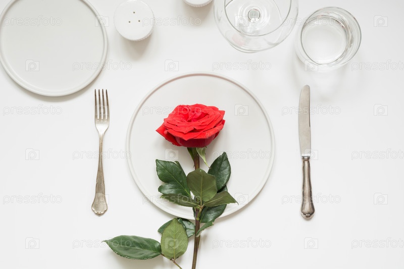 День святого Валентина или день рождения романтический ужин. Элегантная сервировка стола с красной розой