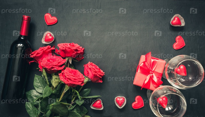 Валентинка. Цветы красной розы, красное вино, сердца и подарочная коробка на черном фоне. Вид сверху с копией пространства
