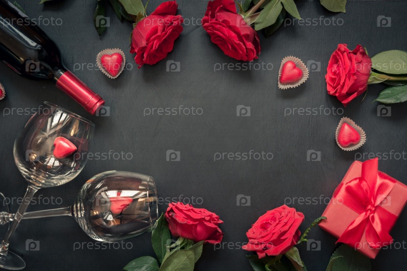 Валентинка. Бордюр из красных роз, красного вина, сердечек и подарочной коробки на черном фоне. Вид сверху с копией пространства