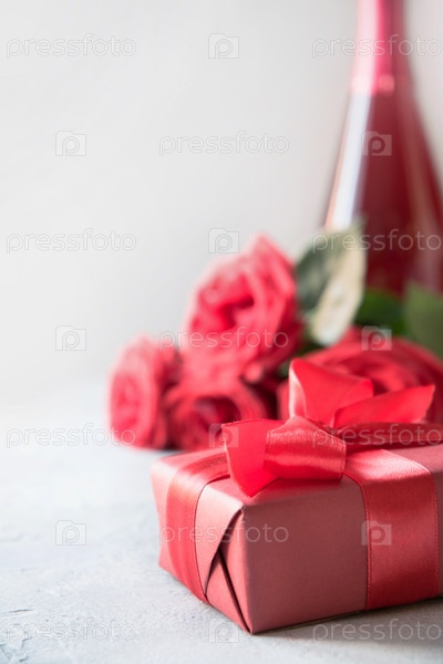 Валентинка с красной подарочной коробкой, розами, бутылкой шампанского на белом. Место для текста