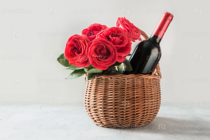 Подарочная корзина, букет красных роз, бутылка красного вина на белом