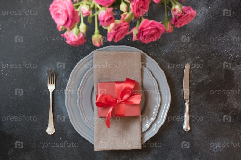 Романтическая сервировка стола с розовыми розами в качестве декора, винтажная посуда, столовое серебро и украшения. Вид сверху