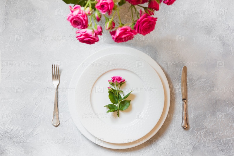Романтическая сервировка стола с букетом розовых роз и украшениями. Вид сверху