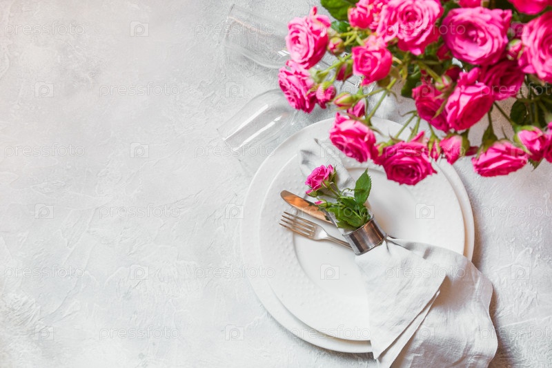 Романтическая сервировка стола с розовыми розами в качестве декора, посуды, столового серебра и украшений. Вид сверху