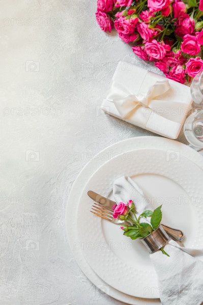 Романтическая сервировка стола с розовыми розами в качестве декора, посуды, столового серебра и украшений. Вид сверху
