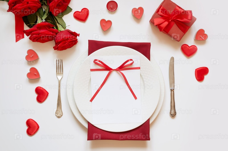 Ужин в день святого Валентина. Романтическая сервировка стола с красными розами. Вид сверху
