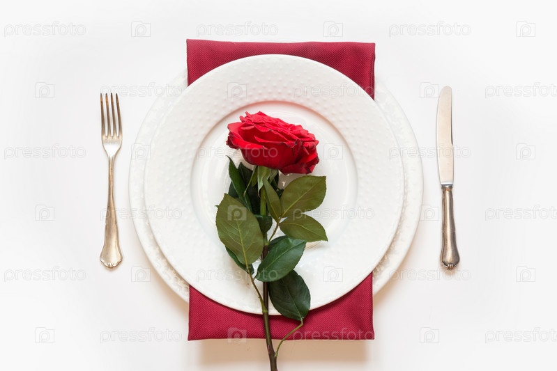 Ужин в день святого Валентина. Романтическая сервировка стола с красной розой. Вид сверху