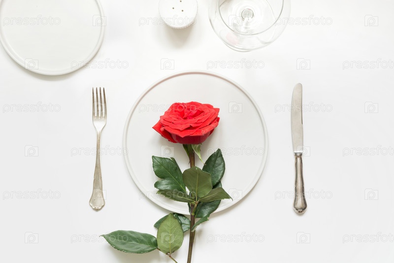 День святого Валентина или день рождения романтический ужин. Элегантная сервировка стола с красной розой