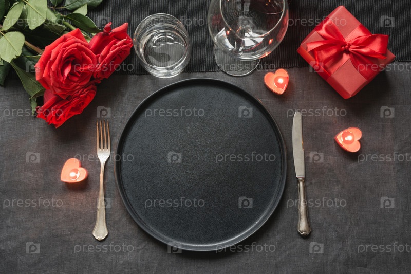 День святого Валентина или ужин на день рождения. Элегантная сервировка стола с красной розой на черной льняной скатерти