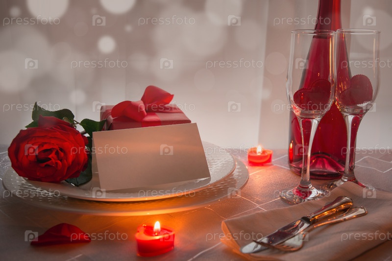 Сервировка стола дня святого валентина с красными розами и шампанским. Приглашение на свидание
