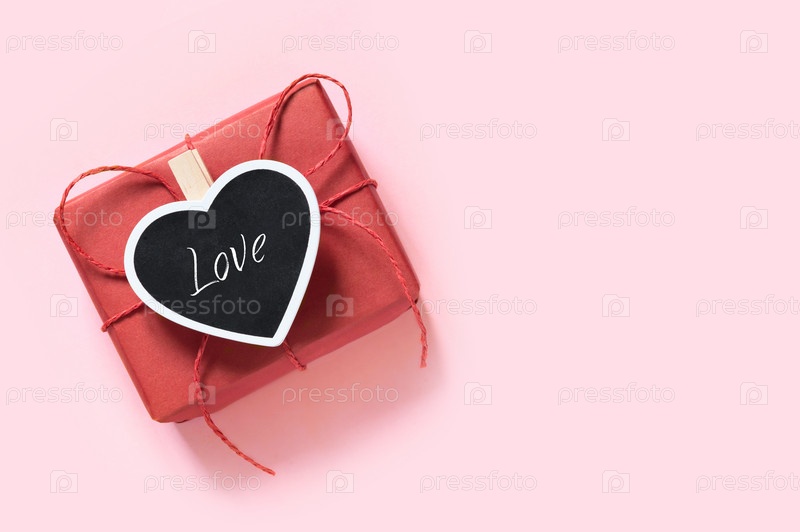 Композиция на день святого валентина: три красные подарочные коробки с прищепкой в виде сердца с местом для текста на доске на пастельно-розовом фоне. Вид сверху