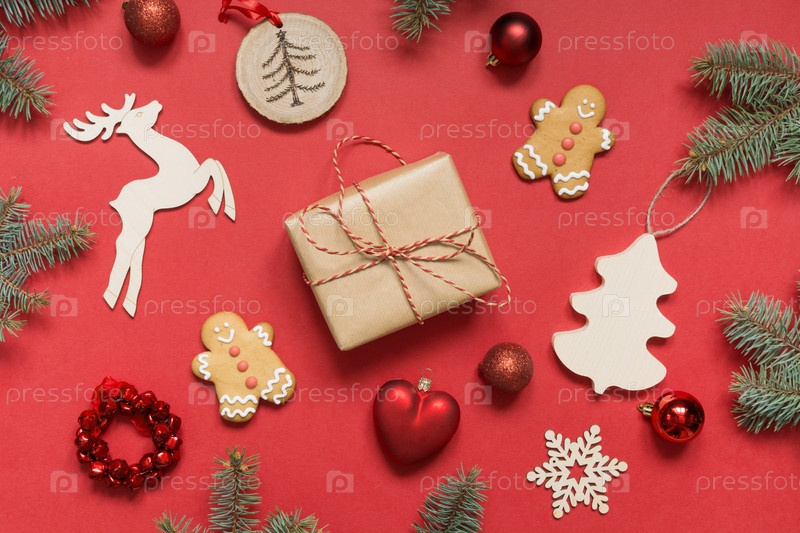 Рождественский подарок, подарочные коробки ручной работы, деревянный декор, вечнозеленые ветки, пряники
