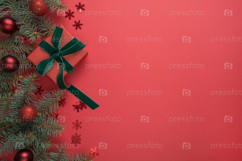 Рождественская граница с елкой и подарком на красном фоне. Открытка. Зимние каникулы. С Новым Годом. Место для текста. Вид сверху. Плоская укладка