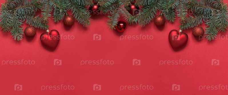 Рождественская граница из красных шаров и сердца, вечнозеленые ветки на красном. Вид сверху, плоская планировка. Рождество. Шаблон, поздравительная новогодняя открытка