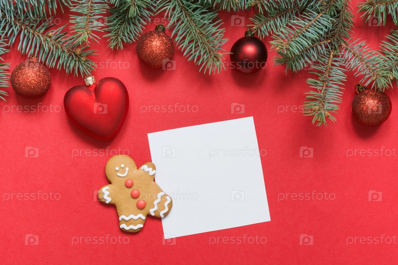Рождественская граница из красных шаров и сердца, вечнозеленые ветки на красном. Вид сверху, плоская планировка. Рождественский праздник. Шаблон, макет, поздравительная новогодняя открытка