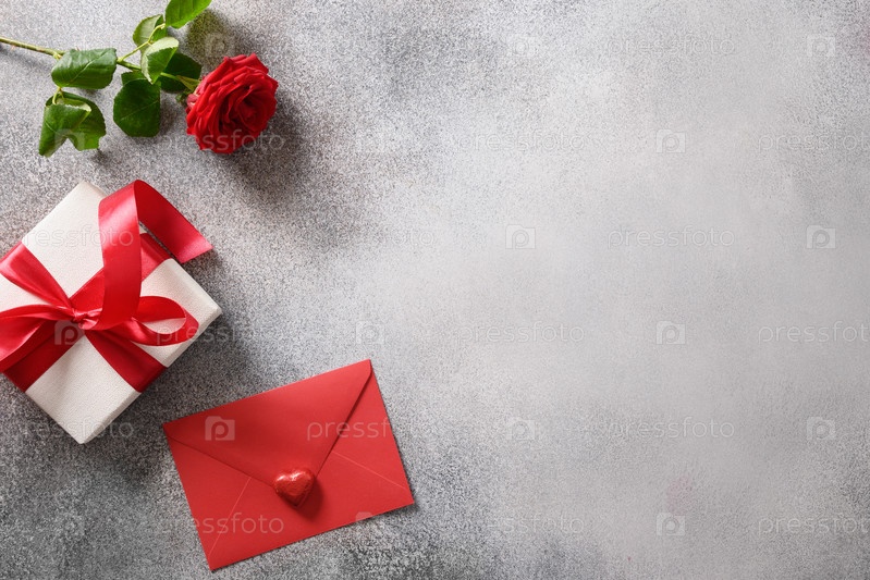 Романтический подарок на день святого валентина, красная роза и красный конверт на сером фоне. Вид сверху. Открытка с копией пространства