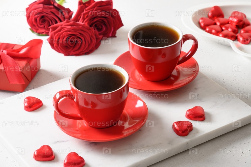 День святого валентина с кофе, конфетами из красного шоколада и розами на белом. Закрыть. Романтическое свидание для двоих